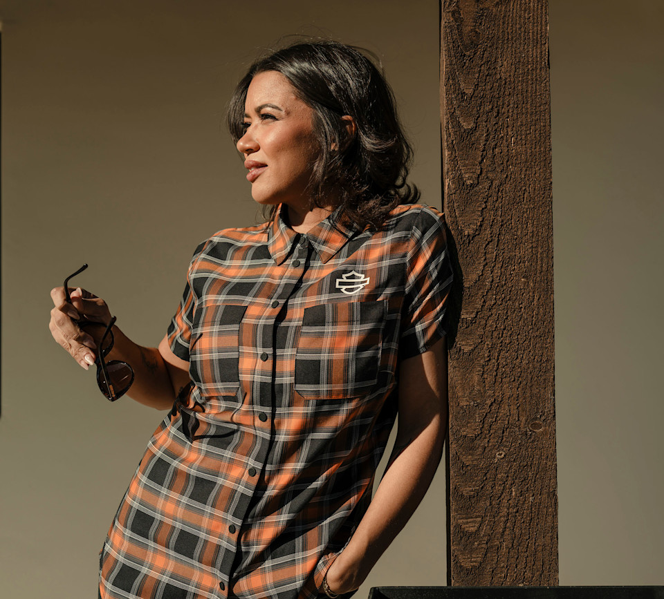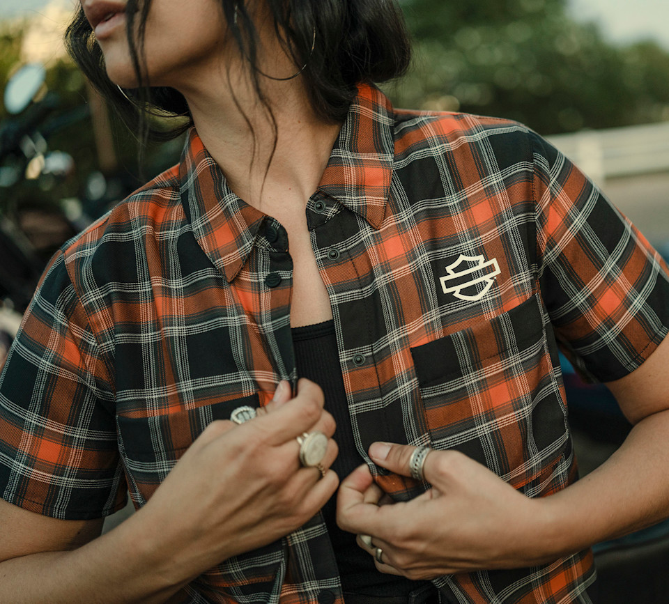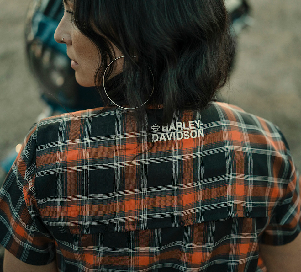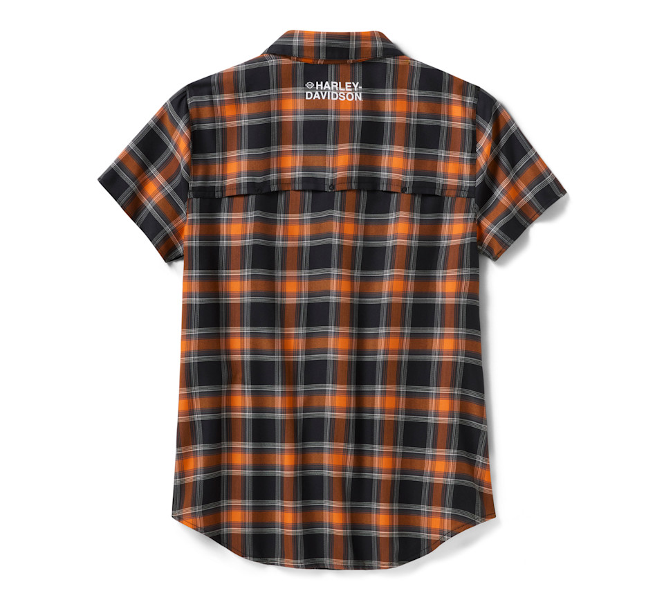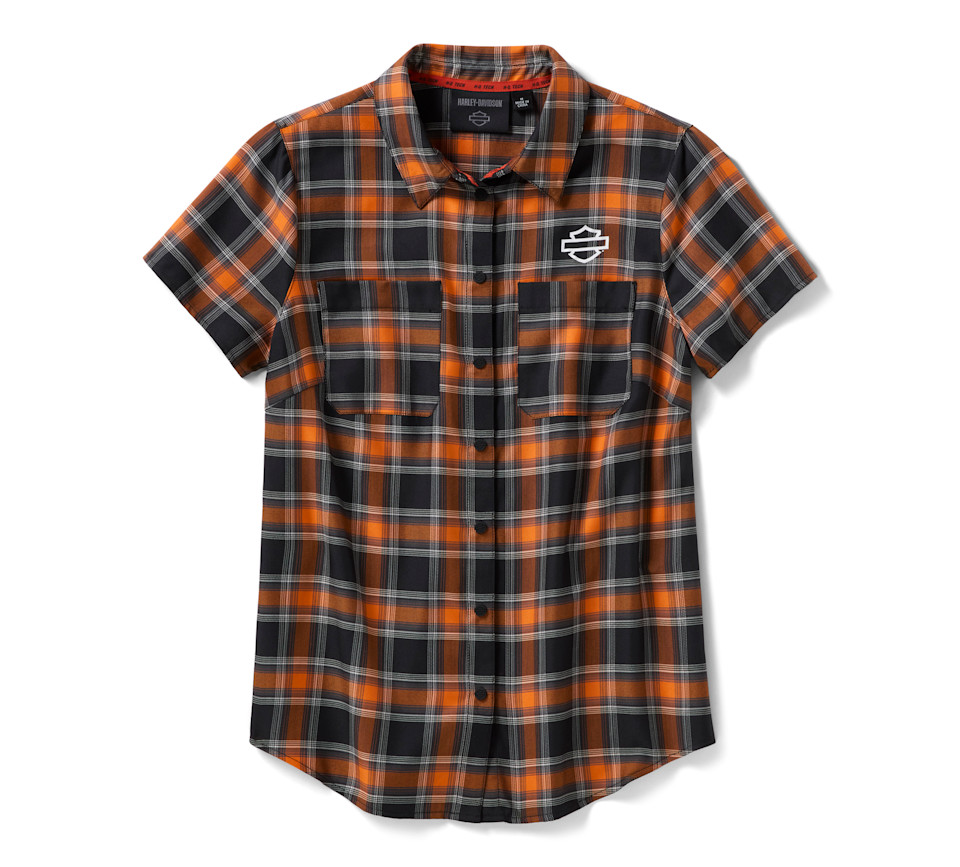 Rester au frais avec style est aussi simple qu'avec la chemise à manches courtes H-D® TECH à carreaux. Elle est fabriquée en matériau COOLMAX® qui évacue l'humidité et intègre des œillets d'aération à l'arrière pour laisser entrer l'air et aider à gérer la transpiration. Cette chemise à boutons-pression pour femmes est dotée de pinces poitrine pour offrir une silhouette plus ajustée et d'un col à boutons-pression dissimulé qui ne flottera pas sous votre équipement de moto. Logo discret sur les deux faces pour offrir un style contemporain plus sobre.