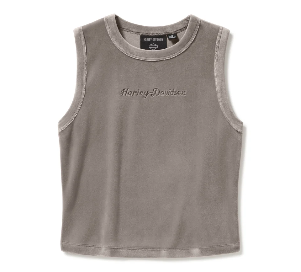 Le confort du velours s'exprime avec ce débardeur à col rond. Il est fabriqué à partir d’un velours de polyester épais avec une touche d’élasthanne pour plus d’élasticité. Ce débardeur pour femmes à la silhouette courte et ajustée intègre une encolure large bordée et des emmanchures. Il est orné d’un motif imprimé sur le devant en broderie ton sur ton brillante pour conférer un look Harley-Davidson discret.