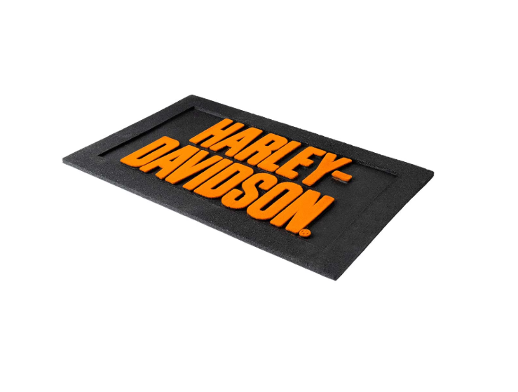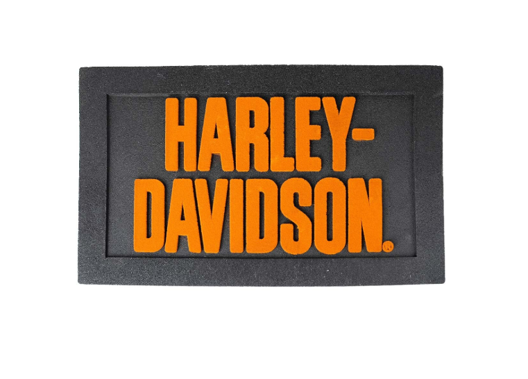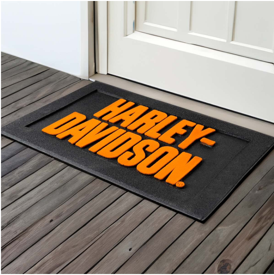 - Tapis d'entrée en caoutchouc antidérapant et durable avec logo Harley-Davidson floqué orange.